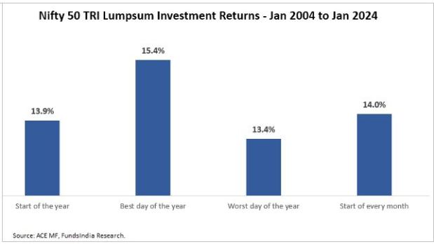 Jiral Mehta, Senior Research Analyst, FundsIndia, says, “We analyzed the lumpsum returns of Nifty 50 TRI over the last 20 years (Jan 2004 to Jan 2024) and compared four common investment strategies.”