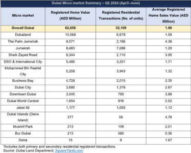 Jumeirah and Dubailand led the way in residential activity, together accounting for 43% of total registered home transactions in the June quarter. In terms of sales value, Dubailand and The Palm Jumeirah dominated with a combined 32% share, followed by Jumeirah and Sheikh Zayed Road, each holding a 13% share. In case of average registered home sales values, Dubai Islands (Deira Island) and The Palm Jumeirah are at the forefront, with AED 4.78 million and AED 4.38 million, respectively.
