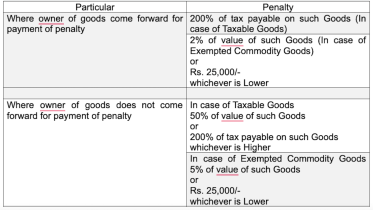| Where owner of goods come forward for payment of penalty | Not lower than 100% tax payable on such goods and Not Higher Market value of goods confiscated |
