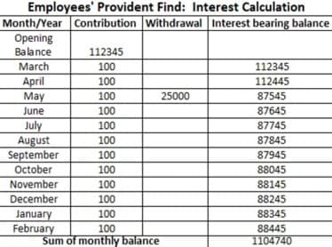 In EPF, the interest is credited on the monthly running balance. Three things are important during calculation of PF interest amount – Opening balance, contributions during the year and any withdrawals during the year.