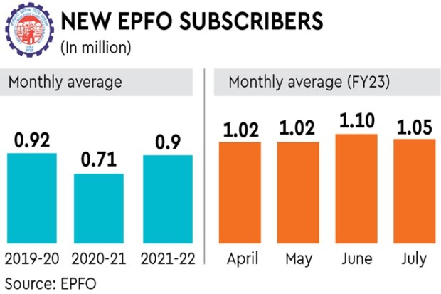 New subscribers under the social security schemes run by the Employees’ Provident Fund Organisation (EPFO) declined moderately in July over the previous month. However, addition of over 1 million subscribers in each of the first four months of the current fiscal still signals a gradual recovery of the job market.