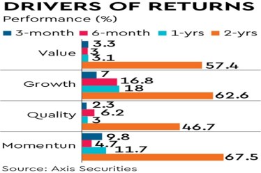 It is a rule-based investing system that buys and sells stocks based on the past returns. Investors purchase stocks that have performed relatively well in a period of time and avoid stocks that have underperformed over a defined period. Anand Vardarajan, business head, Banking, Alternate Products & Product Strategy, Tata Asset Management, says usually, momentum as a theme does well in an upward trending market. “For the last couple of years this has been the trend and not surprisingly, momentum is doing well,” he says.