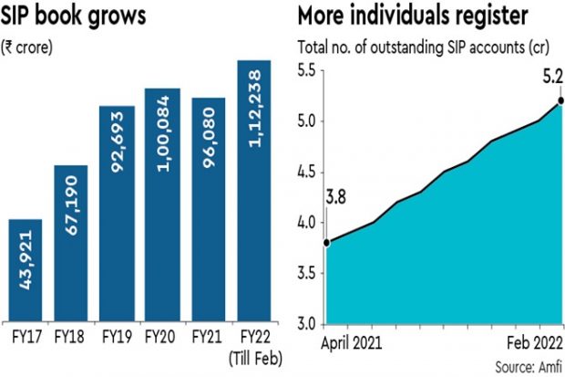 Data from Association of Mutual Funds in India (Amfi) show that SIP inflows have touched Rs 1.1 trillion in this financial year till February, the highest ever. In February, there were 51.7 million outstanding SIP accounts through which investors regularly invested in mutual fund schemes, a growth of 37% from 38 million accounts in April 2021.