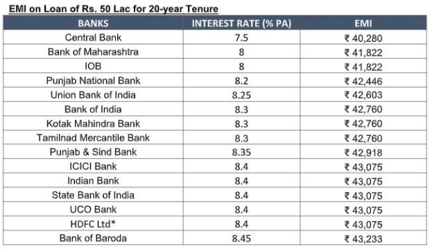 The table below will help you compare the interest rates of around 15 banks and the EMIs for Rs 50-lakh loan for 20-year tenure. You can compare and borrow as per your eligibility and requirements.