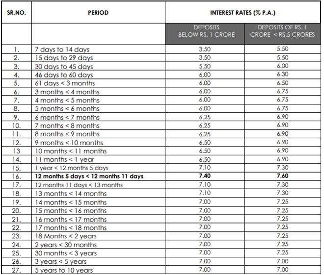 For General public: The country’s largest lender provides an interest of 5.75 percent to those who want to fix a certain amount of money from a tenure of ‘7 days to 45 days’. For a tenure of ’46 days to 179 days’, it provides 6.25 per cent while for ‘180 days to 210 days’, it provides an interest of 6.35 per cent. For a tenure of ‘211 days to less than 1 year’ and for a tenure of ‘1 year to less than 2 years’, it offers an interest rate of 6.40 percent and 6.65 per cent respectively.