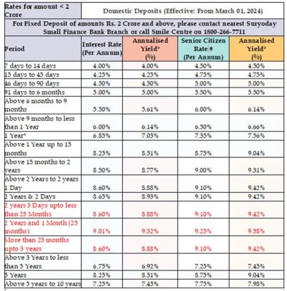 Suryoday Small Finance Bank (SSFB) has revised interest rates on fixed deposits with effect from March 01, 2024. Interest rates for 25-month tenor was revised by 41 basis points (bps).