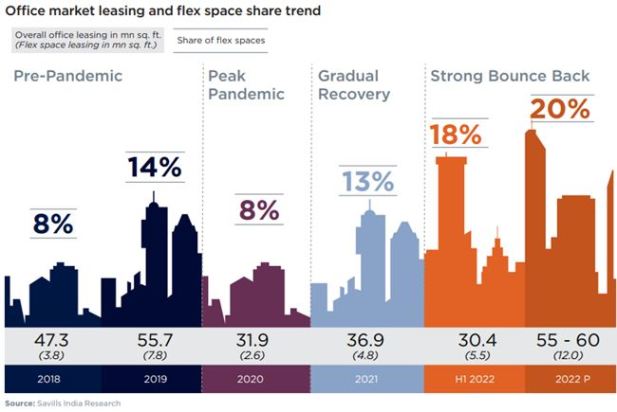 Savills India Research expects flex spaces across India’s six major cities to witness a new peak in terms of gross absorption, with the sector likely to account for 20% market share of the overall office space demand reaching 12.0 mn sq ft by the end of 2022, surpassing the pre-pandemic 14% share in 2019.