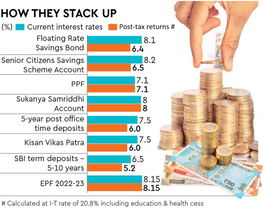 Experts say investors must keep in mind that we are at the peak interest rate which is likely to come down once the inflation outlook improves. So, when interest rates fall, the coupon of FRSBs will also come down. In such a case, locking at current bank fixed deposits or small savings would be more attractive over an investing period of five years.