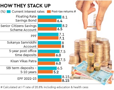 Adhil Shetty, CEO, Bankbazaar.com, says the FRSB offers assured returns, capital protection and the sovereign guarantee is attractive. “However, in the current environment, a peaking of interest rates will be followed by a fall in rates. Therefore, the returns on NSC and by extension FRSB will fall as well in the near future. If you are a senior citizen you could lock into a 7.5 to 8% fixed deposit for an assured return of a similar time-frame.”