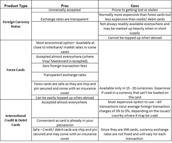 You can choose from a variety of products such as foreign currency cash, forex cards, debit and credit cards and traveler’s cheques to take care of your expenses overseas. So, it’s natural to find yourself in a dilemma regarding which one to pick. However, it’ll be easier for you to make a choice once you understand the pros and cons of each product: