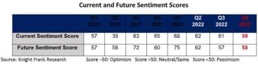 The Current Sentiment Score has moderated from 61 in Q3 2022 to 59 in Q4 2022, mainly on account of a bleak global economic scenario and geopolitical risks due to the prolonged Russia-Ukraine war. However, the continued resilience of the Indian economy and of the real estate industry has influenced an upward movement in the Future Sentiment Score, according to the 35th edition of the Knight Frank-NAREDCO Real Estate Sentiment Index Q4 2022 (October – December 2022) report.