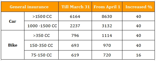 For two wheelers in the category of 75-150 CC people have to pay a third party insurance premium of Rs 619, but from April 1, the rates will increase up to Rs 720, resulting in a 16 percent hike in the premium.