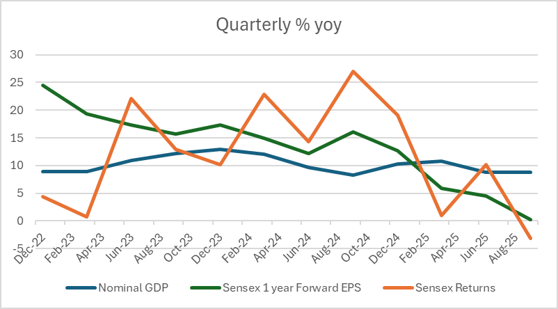 | Date | Nominal GDP | Sensex Returns | Sensex 1 year Forward EPS |