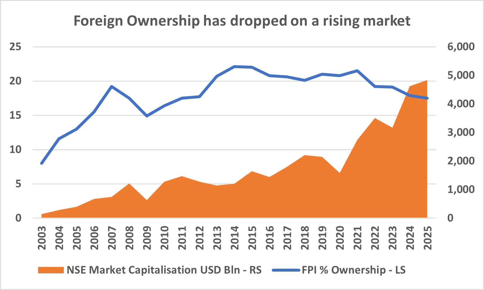 Over the last 5 years, as the markets have surged and the market capitalisation has increased, foreign ownership has dropped to 17.5% of the whole market due to lack of net new flows. When seen for the narrower NSE Nifty-50 Index, the FPI share has fallen from >28% to ~24.5%.