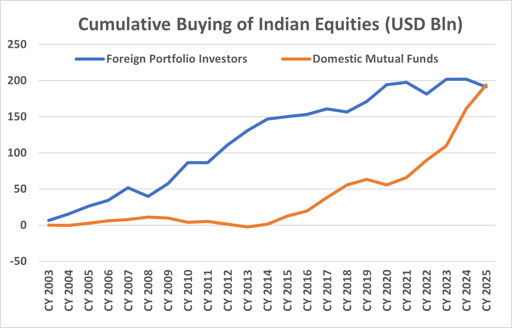The ‘blue’ Foreign Portfolio Investor’ line has plateaued.