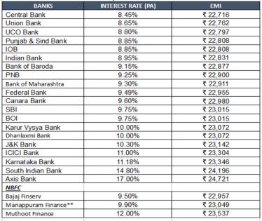 Interest Rates & EMIs on Gold Loan of Rs 5 Lakh for 2-Year Tenure