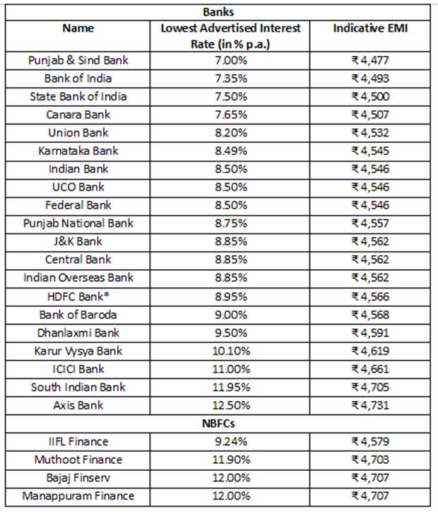 Do note, we have only considered the lowest advertised gold loan interest rates for each of the lenders, have not considered processing fee or any other charges for EMI calculation, and the rates applicable to you could be higher depending on your loan amount, LTV ratio, loan tenure or any other terms and conditions of your chosen lender.