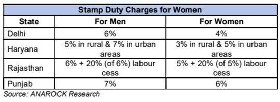 - Lower stamp duty is another benefit women homebuyers enjoy. Stamp duty charges are lower if the property is registered in a woman’s name, albeit with variations from state to state. The exemption varies from 1-2% across states, and may even vary within a particular state, based on the classification of regions as ‘urban’ and ‘rural’. For instance, Delhi, UP, Rajasthan, Punjab and Haryana offer a relaxation in stamp duty for women buyers.