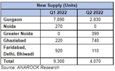 As per ANAROCK data, overall new housing supply in Delhi-NCR declined by 56% on quarterly basis – from 9,300 units in Q1 2022 to nearly 4,070 units as of Q2 2022.