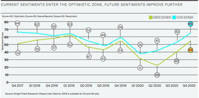 Commenting on the same, Shishir Baijal, CMD, Knight Frank India, said, “Both the Current and Future Sentiment scores in Q4 2020 have seen great surge in the latest survey backed by revival in both residential and office market real estate that have been highly encouraging. The sector saw a lift in the market’s mood and increased stakeholder expectations of a stronger recovery in the next six months. As we begin our journey into 2021 with a positive outlook, it is important to closely watch the performance of the key economic indicators in the coming months to check the sustainability of the growth seen in the last two quarters of 2020. Equally crucial is the development of the vaccine and its widespread availability for the masses. These two factors will largely determine the performance of the real estate sector in the coming months.”