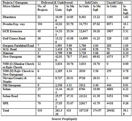 The data of delivered projects reflect that there is no absorption issue in the delivered projects of Gurugram as unsold inventory in the completed projects is less than 2.5%, which is quite usual. Now, let’s look at the combined data of delivered and undelivered projects: