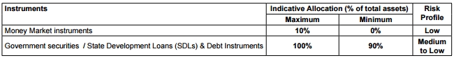 The scheme will invest in securitised debt which may be up to 25% of the net assets of the scheme. The scheme will not invest in foreign securities, securities lending or engage in short selling.