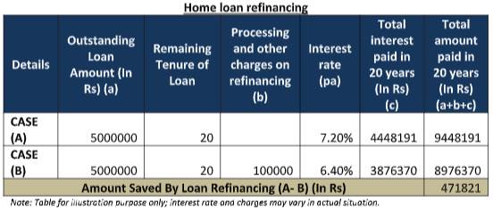 Refinancing can significantly bring down the total interest payable on a home loan. For example, Mr. R Kumar had availed a home loan with an outstanding loan amount of Rs 1 crore from XYZ bank, the applicable interest rate being 7.1% pa for the remaining loan tenure of 20 years. At the same time, several banks in the market were ready to offer him a home loan transfer at an interest of only 6.4% pa. So, there was a difference of .7% pa resulting in a saving of approx. Rs 10 lakh in 20 years if he transfers his loan to a new bank.