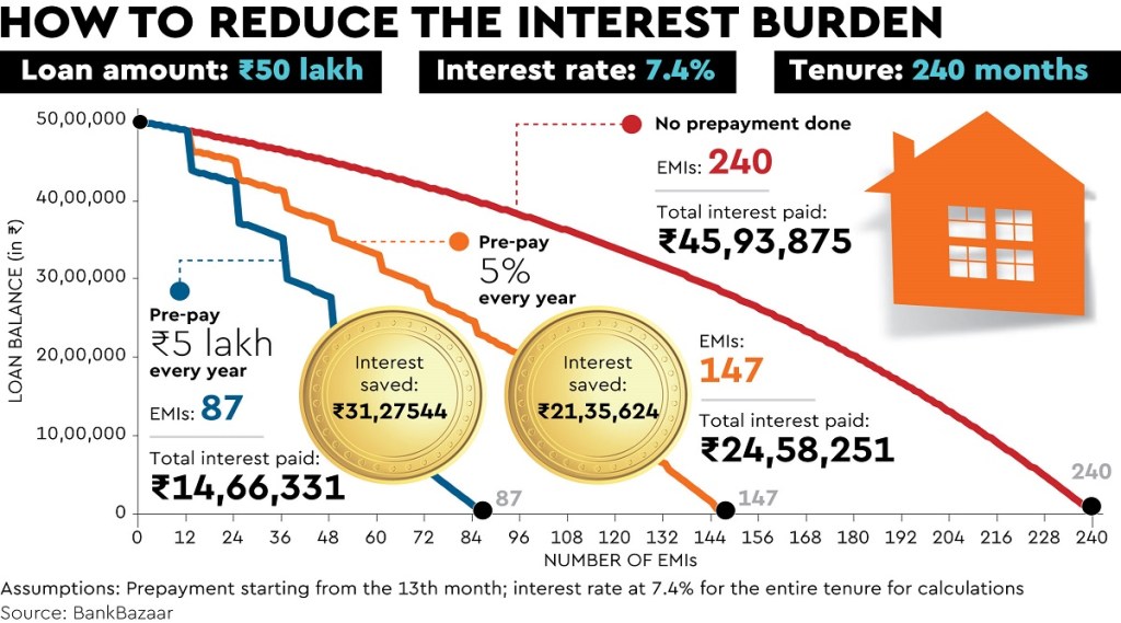 Experts suggest borrowers should not wait for years to accumulate a large amount to prepay. Instead, they should start prepaying, say, 5% of the outstanding principal every year. In such a case, on a loan of Rs 50 lakh for 20 years, assuming 7.4% interest, the tenure will reduce from 20 to 12 years and the borrower will save around Rs 21.35 lakh of interest payment. By prepaying 5% of the loan balance every year, around 32% of the loan will be paid through pre-payments and the rest through EMIs, an analysis from Bankbazaar shows.
