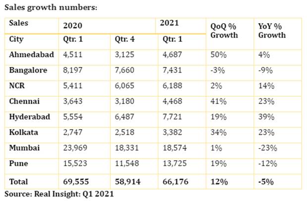 According to Real Insight – Q1CY21, builders sold a total of 66,176 homes in the primary market in the January-March quarter of 2021, a time marked with several state governments, including Maharashtra and Delhi, announcing stamp duty and circle rate reductions to boost buyer sentiment and housing sales.