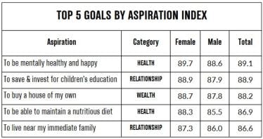 Mental health with 89.1 ranked as the most important and most chosen goal. Children’s education (88.9) continues to be a top priority in the top 2, so does home ownership at the third place with (88.2). The report studies salaried men and women between the ages of 22 and 45 across 17 goals under five broad aspirations: Health, Wealth, Fame, Relationship, and Personal Growth.