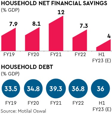 The estimate by Motilal Oswal Securities suggests the total savings of households would have come off to 15.7% of GDP in H1FY23, compared with a level of roughly 20% of GDP in the previous five years.