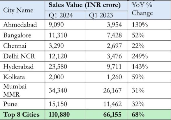 In its quarterly report titled ‘Real Insight Residential – January–March 2024’, PropTiger.com reported that housing sales in value terms rose to Rs 1,10,880 crore in January-March 2024 from Rs 66,155 crore in the year-ago period.