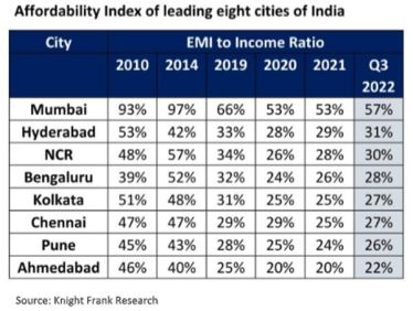 Knight Frank’s Affordability Index also states that the four consecutive repo rate increases (a total of 190 bps) have increased EMI load by 7.4% and reduced house purchase affordability by an average of 2% across markets. Despite the rising rates and falling affordability index, investors and end consumers have chosen real estate. This is clearly evident with the kind of traction witnessed in term of sales. The key reason for this is that the affordability level, when considered from a financing benchmark of 50% or less, remains amenable for housing for most cities with an exception of Mumbai. Even in case of Mumbai the level is much better when compared to many pre pandemic years giving comfort to homebuyers.