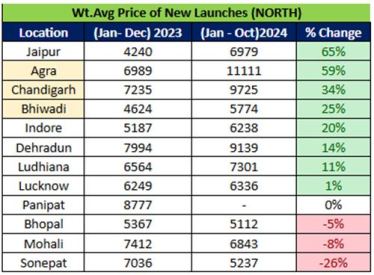 In Western India, Gandhi Nagar saw weighted average price of new launch projects rise by 19% to Rs 4844 per sq. ft. between 2023 and October 2024, followed by Surat (14%) and Nagpur (12%).