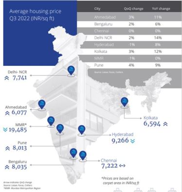 Amidst robust housing demand and quality launches by top developers, housing prices across the top eight cities in India continue to head northwards. During Q3 2022, overall housing prices in India increased 6% YoY, according to CREDAI – Colliers – Liases Foras’ Housing Price-Tracker Report 2022.