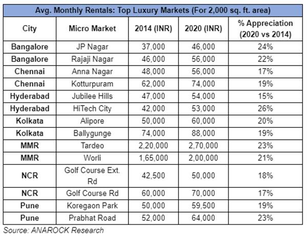Amidst various industry reforms in the last seven years, multiple new trends emerged in the Indian residential real estate market. Strikingly, housing rentals in key luxury markets saw better y-o-y growth between 2014 and 2020 than average capital prices in the same localities, according to an ANAROCK study.
