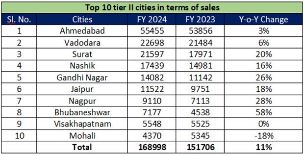 Top 10 tier II cities – Ahmedabad, Vadodara, Surat, Nashik, Gandhi Nagar, Jaipur, Nagpur, Bhubaneshwar, Visakhapatnam, and Mohali – reported sales of 1,68,998 residential units in 2023-24, up 11% from 1,51,706 homes in 2022-23.