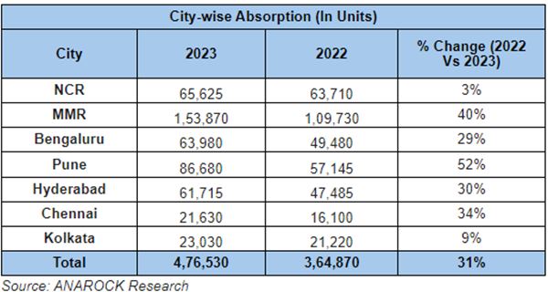 Residential sales stood at approx. 4,76,530 units in 2023 against 3,64,870 units in 2022 across the top 7 cities – rising yearly by 31%. MMR, Pune, Bengaluru, Hyderabad, and NCR, together accounted for 91% of the sales in the year.