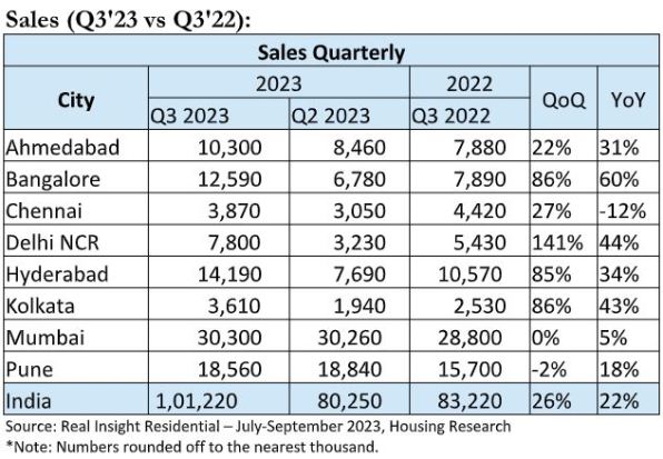 The report, titled ‘Real Insight Residential – July-September 2023’, highlights that sales of residential units have climbed to 1,01,220 units in the third quarter from 83,220 units in the same period last year.