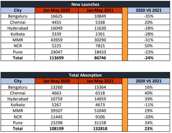 Chennai and NCR are the cities where new launches witnessed a growth in the first five months of 2021 versus the first five months of 2020 at 20% and 50%, respectively, whereas Bengaluru, Hyderabad, Kolkata, MMR and Pune witnessed a downfall of 35%, 28%, 28%, 31% & 23%, respectively, in home sales during the same period.
