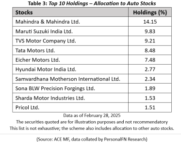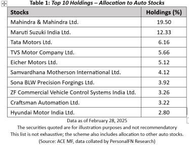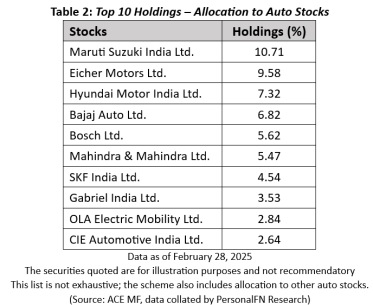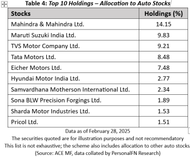 The fund also includes important auto part suppliers such as Samvardhana Motherson, Sona BLW, and ZF Commercial Vehicle, offering exposure to both vehicle production and the automotive supply chain. Currently, the overall exposure to auto stocks accounts for 96.98% of the scheme’s assets.