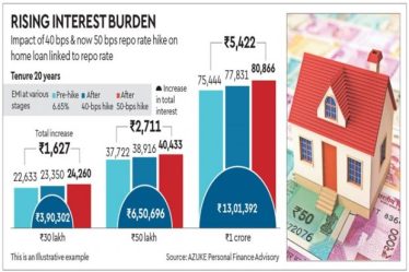 With the total 90 bps increase in repo rate, the EMI on a Rs 30-lakh home loan will increase by Rs 1,627, by Rs 2,711 for a Rs 50-lakh loan and by Rs 5,422 for a Rs 1-crore loan, all for a 20-year tenure. If borrowers choose not to increase the EMI, then the tenure of the loan can increase up to 46 months.