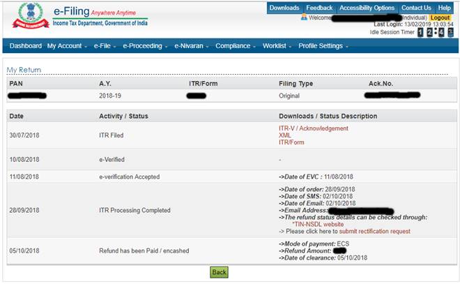 - In case it shows ‘ITR Processed’, you may click on the acknowledgement number to go inside to see if the refund amount has been paid or not and if paid, by which mode.
