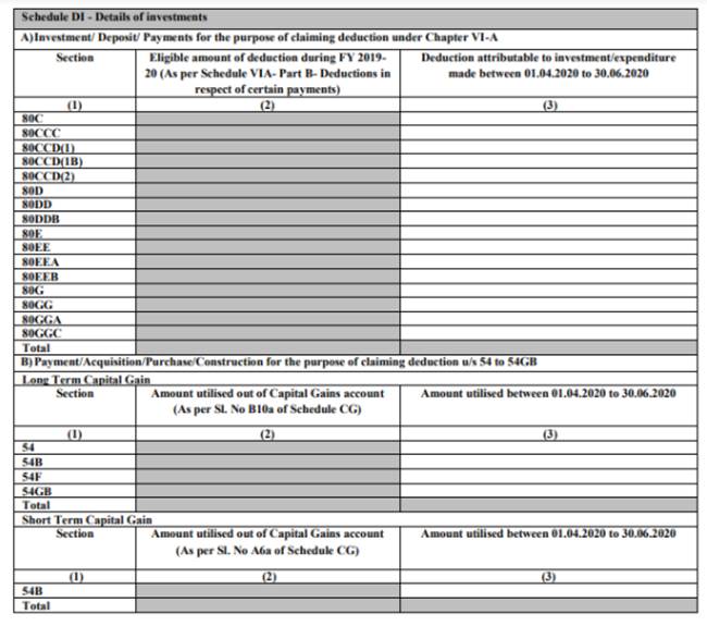 CBDT had updated all the ITR forms to incorporate the investments made in this extended period in a new Schedule DI (Details of Investment) separately. Hence all the investments made from 1st April to 31st July to claim tax deductions for FY 2019-20 are to be mentioned in this schedule DI for a clear differentiation.