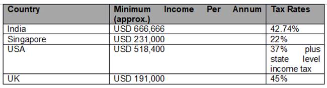 India follows a progressive tax system for personal income wherein the tax rate increases as the taxable amount increases. The individual tax rate ranges from 5% to 30% (plus applicable surcharge and cess) depending upon the income earned during a particular financial year. Any individual with an income of more than Rs 10 lakh (USD 13,333 approximately) per annum is taxed at the highest rate of 30% (plus applicable surcharge and cess). When one adds the various surcharges and cesses, the maximum effective tax rate applicable to an individual earning more than Rs 5 crore (USD 666,666 approximately) would be about 42.74%. Thus, effectively, for tax purposes, ultra HNIs would be individuals having a taxable income of more than Rs 5 crore per annum.