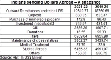 Indians sending money abroad has seen an increase in the year 2021-22. Almost every segment including deposits, purchase of immovable property, Investment in equity, debt, sending of gifts, donations, international travel, maintenance of close relatives, medical treatment, studies abroad showed an increase over previous year.