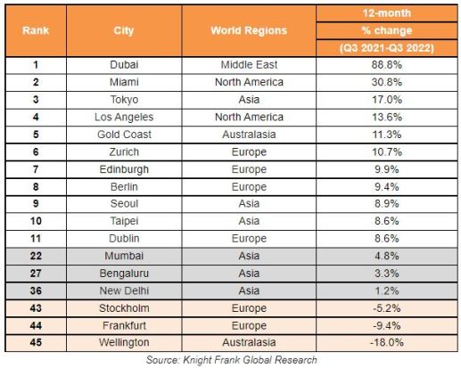 However, all three Indian cities (Mumbai, Bengaluru and New Delhi) registered an increase in average annual prices in Q3 2022. Mumbai moved up from 39th rank in Q3 2021 to 22nd rank in Q3 2022. Bengaluru and New Delhi too witnessed an upward movement in index ranking from 41th rank and 38th rank, respectively, in Q3 2021 to 27th rank and 36th rank, respectively, in Q3 2022.