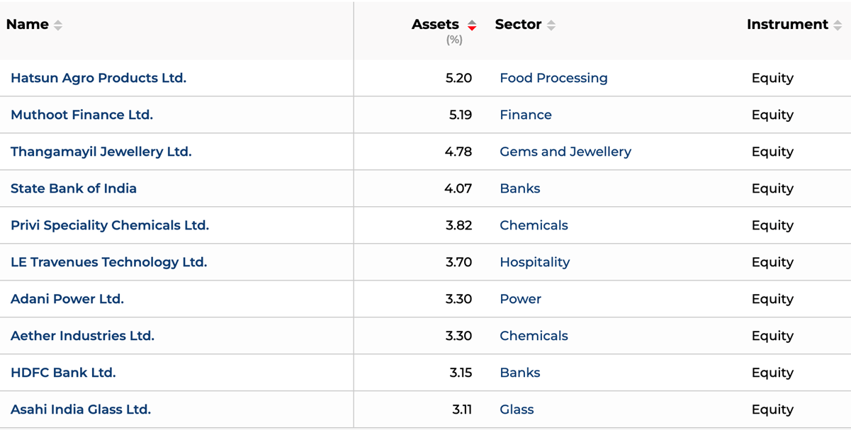 The top 10 stocks comprise 39.9% of the portfolio and include names such as Hatsun Agro (5.2%), Muthoot Finance (5.2%), Thangamayil Jewellery (4.8%), etc.