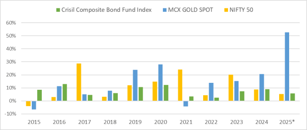 10-Year Performance of Gold, Equity, and Bonds
