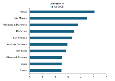 The top 10 stocks comprise 33.5% of the fund’s portfolio and include names such as Maruti (5.1%), Tata Motors (4.5%), Mahindra & Mahindra (3.8%), etc.